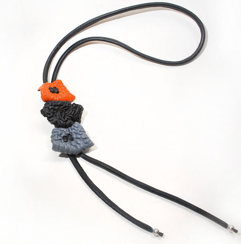 Contemporary long sculptural necklace featuring color block pendant on the thick stitched leather cord. The chunky pendant is one-of-a-kind, bold and textural. This unique modern necklace is very light, unusual and eye-catching.