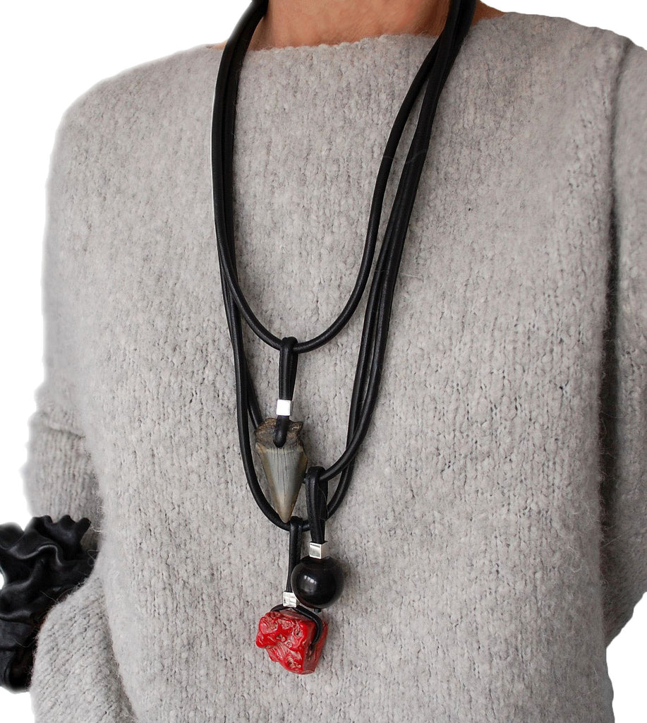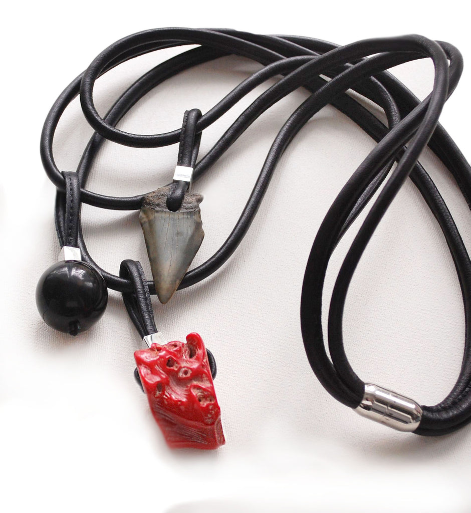 Unusual long chunky necklace featuring three natural elements- a piece of coral, black horn round bead and Megalodon Shark's tooth on the thick natural leather cords. Megalodons were enormous sharks that lived 25 millions years ago. Feeding on whales, the Megalodon was the most fearsome and voracious predator ever to have lived on Earth. Unusually chunky Coral piece has irregular shape, texture and beautiful color.