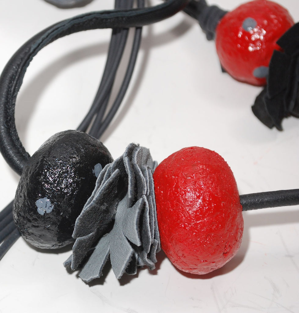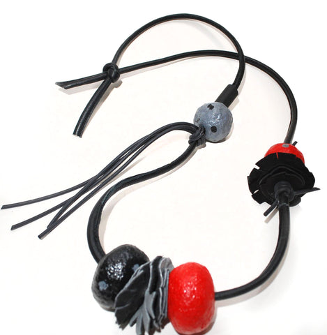 Contemporary long sculptural necklace featuring chunky colorful beads on the thick stitched leather cord.  This unique modern necklace is very light, unusual and eye-catching.