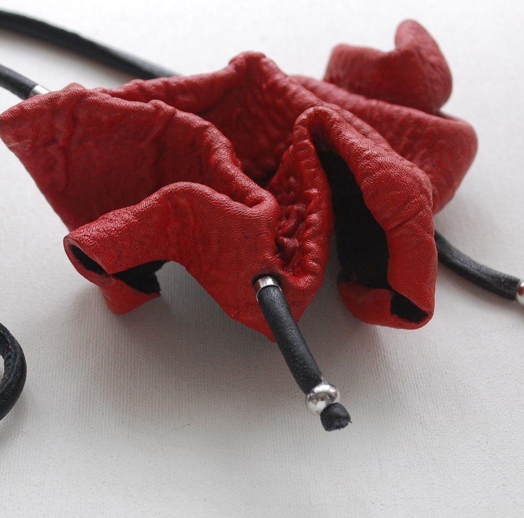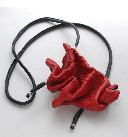 Contemporary long sculptural necklace featuring bright red abstract pendant on the thick stitched leather cord. This unique modern necklace is soft, very light, unusual and eye-catching.