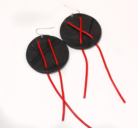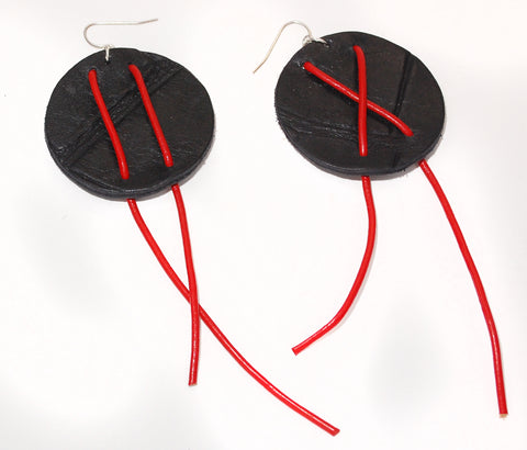 Dangle earrings with black natural leather disks and asymmetrical red leather strings design. Elegant long hooks are sterling silver.